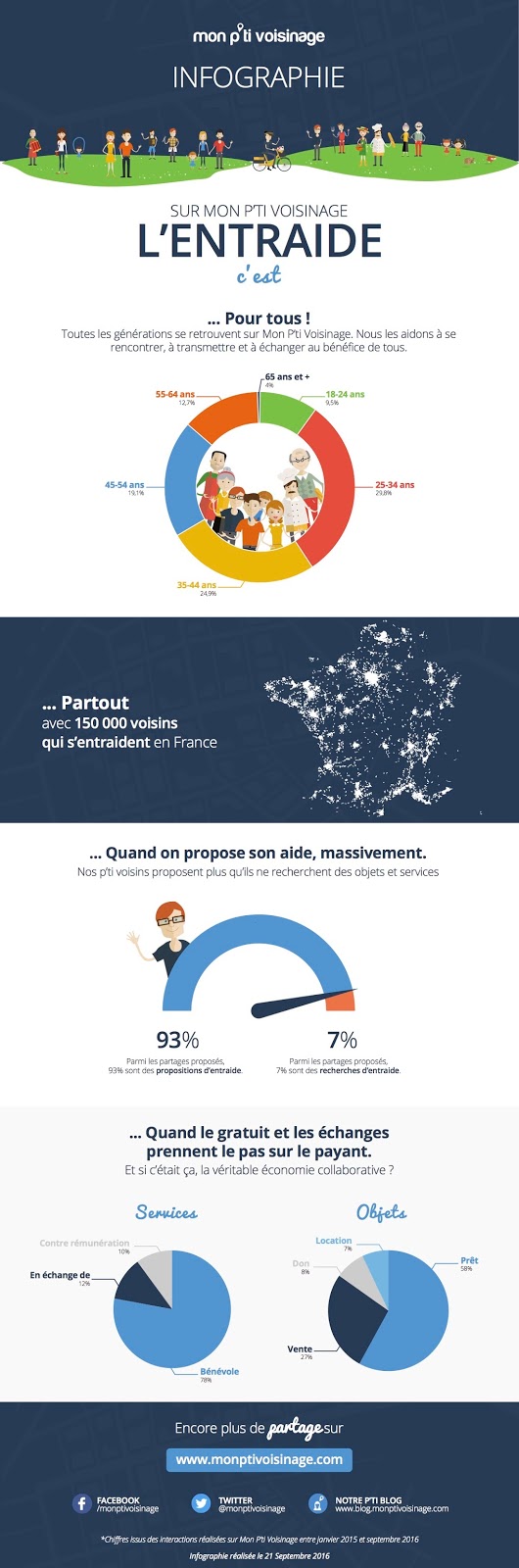 La rédaction du blog Mon P’ti Voisinage tenait à préciser deux trois choses parce que non, l’économie collaborative ce n’est pas qu’une histoire de dollars. Non, ce n’est pas non plus uniquement l’affaire d’entités comme UBER et BLABLACAR lancés dans une course au profit. Certains acteurs inventent des alternatives, plus engagées, plus sociales, moins intéressées. Et évidemment, nous en faisons partie. C’est donc le moment de faire un petit panorama chiffré de l’entraide sur notre réseau !
